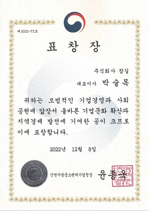 인천지방중소벤처기업청장 표창장 수상 및 인천경영포럼 송년의 밤 행사 참석 페이지 정보 작성자 최고관리자 작성일22-12-09 13:10 조회27,810회 댓글0건 관련링크 본문 인천지방중소벤처기업청장 표창장 수상 및 인천경영포럼 송년의 밤 행사 참석 댓글목록 등록된 댓글이 없습니다. 이전글 다음글 목록